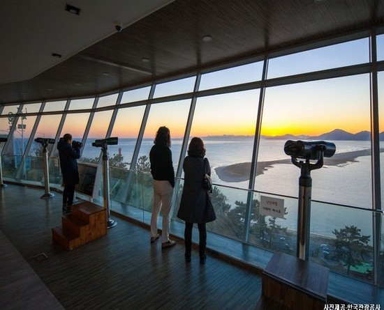 아미산 전망대 지상층은 난간을 통해서 바로 일몰을 볼 수 있도록 되어 있고, 2층과 3층은 실내에서도 편하게 일몰을 감상할 수 있도록 카페 및 쉼터가 마련되어 있다.